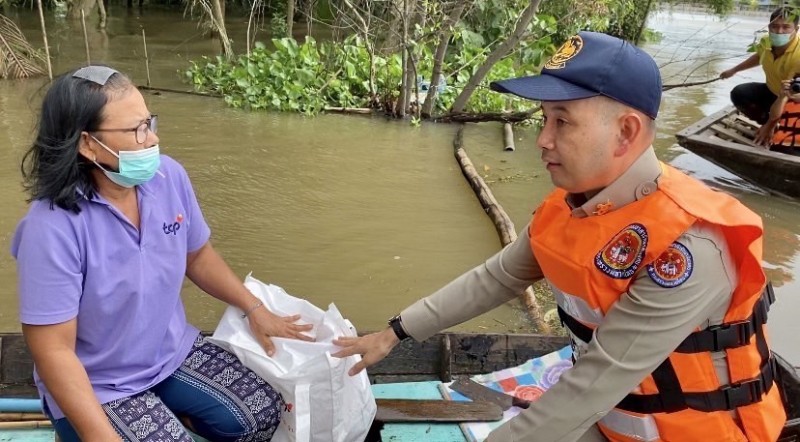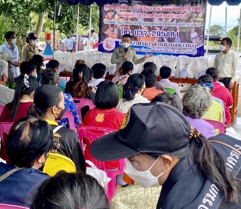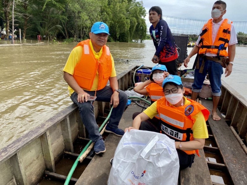 นายอำเภอบ้านสร้างจึงเล็งเห็นว่า เพื่อบรรเทาทุกข์ของพี่น้องประชาชนในการดำรงชีวิต และสร้างขวัญกำลังใจให้กับพี่น้องประชาชน นอกเหนือไปจากการป้องกันเหตุอุทกภัยในเบื้องต้น อาทิ การสร้างแนวกั้นน้ำจากกระสอบทราย รวมถึงการอำนวยความสะดวกในการใช้ชีวิตประจำวัน เช่น การตั้งจุดบริการรับฝากสิ่งของมีค่า หรือการส่งต่อเรือพายที่ได้รับการสนับสนุนจาก สำนักงาน ปภ. จ.ปราจีนบุรี ให้แก่ประชาชน นายอำเภอบ้านสร้างจึงได้เร่งประสานขอรับการสนับสนุนสิ่งของอุปโภค - บริโภค จากบริษัท ที.ซี. ฟาร์มาซูติคอล อุตสาหกรรมจำกัด เพื่อนำมาส่งต่อให้กับประชาชนผู้ประสบภัย โดยเฉพาะในพื้นที่เสี่ยงของตำบลบางแตน, ตำบลบางยาง และตำบลบางกระเบา