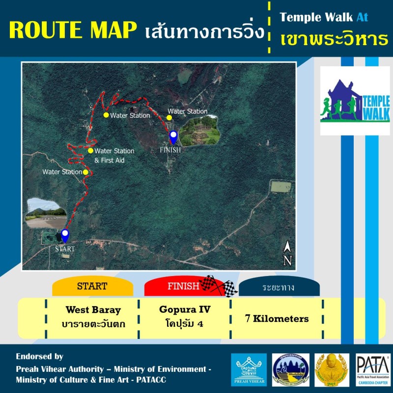 เมื่อเร็วๆ นี้ ที่บริเวณปราสาทพระวิหาร ทางฝั่งประเทศกัมพูชา Pacific Asia Travel Association (PATA) โดย ดร.ธร สินัน ประธาน The Cambodia Tourism Marketing Research and Promotion PATA Cambodia Chapter ประเทศกัมพูชา ร่วมกับ นางวาสิตา น้อยพรหม นายกสมาคมธุรกิจท่องเที่ยวจังหวัดศรีสะเกษ ประธานเขตภาคตะวันออกเฉียงเหนือ และคณะ ร่วมเดินทางสำรวจพื้นที่ เพื่อเตรียมจัดกิจกรรมการวิ่งเทรล ขึ้นสู่ปราสาทพระวิหาร ราชอาณาจักรกัมพูชา ซึ่งนับเป็นครั้งแรกของโลกที่จะจัดขึ้น ในวันที่ 29 ตุลาคม 2565 ตั้งแต่เวลา 06.00 น. ปล่อยตัวจากจุดจำหน่ายตั๋ว ที่นักท่องเที่ยวจะขึ้นสู่ปราสาทพระวิหาร จากถนนในฝั่งประเทศกัมพูชา โดยระยะทางได้กำหนดไว้เพียงระยะเดียว คือ ทั้งวิ่ง ทั้งเดิน ระยะทาง 7 กิโลเมตร ที่เป็นทางลาดชัดขึ้นสู่ดินแดนประวัติศาสตร์อันสำคัญของโลก