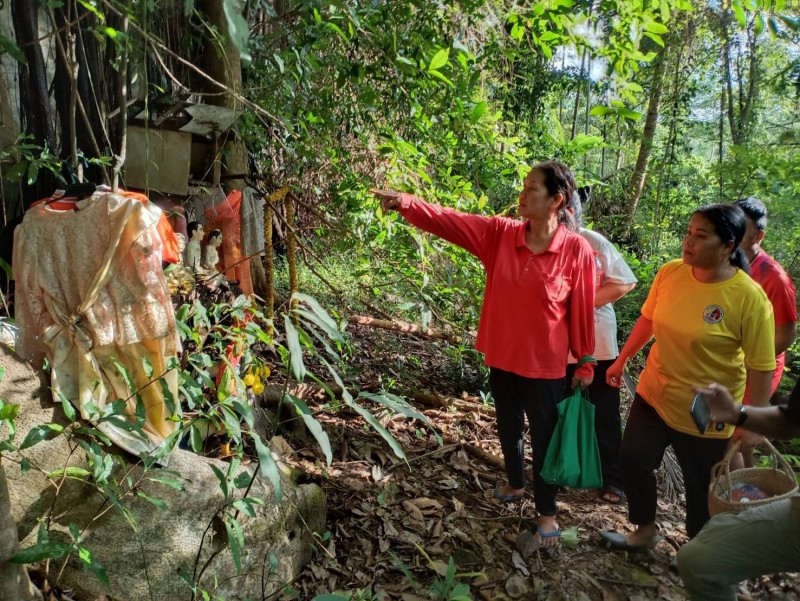 ซึ่งสถานที่ดังกล่าวอยู่ทางด้านทิศตะวันออกเฉียงเหนือของหมู่บ้าน พื้นที่ส่วนใหญ่ของบริเวณดังกล่าวเป็นเชิงเขา มีผาหินขนาดใหญ่ สลับซับซ้อน เป็นขั้นบันได ตามแนวเชิงเขา โดยชาวบ้านในพื้นที่ได้ปลูกยางพารา ทุเรียนภูเขาไฟ และมันสำปะหลัง เมื่อเดินลงไปบริเวณหน้าผา หรือปากถ้ำ ซึ่งชาวบ้านเรียกจุดนี้ว่า “ถ้ำรัตนะ” พบต้นไทรขนาดใหญ่อยู่บริเวณปากถ้ำ ริมหน้าผา ส่วนที่บริเวณรากไทร มีรูปปั้นตา-ยาย และศาลไม้ผุพัง ตั้งอยู่ พร้อมกับมีผ้าเจ็ดสีผูกรอบต้นไม่ใหญ่ อีกทั้งยังมีชุดไทยโบราณ และเสื้อผ้าเด็ก รวมทั้งของเล่นเด็ก ถูกแขวนไว้หลายชุด ซึ่คาดว่าชาวบ้านที่มาขอโชคลาภแล้วประสบความสำเร็จนำมาแก้บน