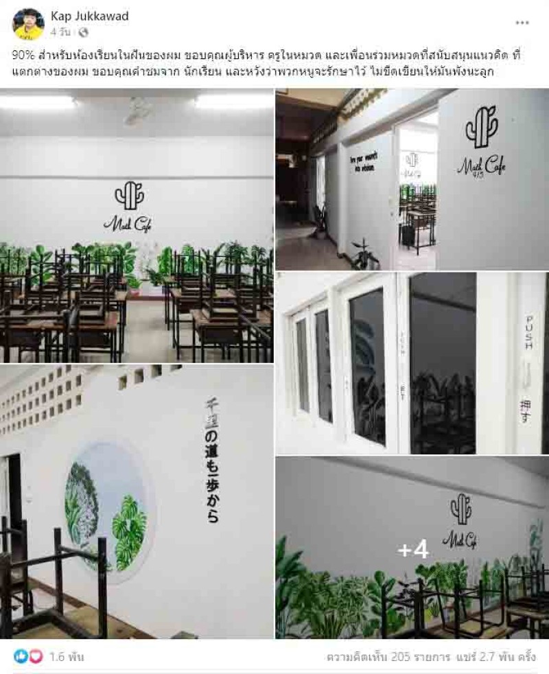 ทั้งนี้ จากการตรวจสอบพบว่า ครูคณิตศาสตร์คนดังกล่าวชื่อว่า นายจักรวรรดิ ไชยโคตร เป็นครูสอนคณิตศาสตร์ ที่โรงเรียนวังน้ำเย็นวิทยาคม ต.วังน้ำเย็น อ.วังน้ำเย็น จ.สระแก้ว ตำแหน่งข้าราชการครูวิทยฐานะ บอกว่า "ต้องบอกเลยว่าโครงการนี้จะไม่เกิดขึ้นถ้าไม่มีผู้บริหารที่ดีและใจกว้าง ผมขอขอบคุณทุกท่านที่สนับสนุน ขอบคุณหัวหน้าหมวดที่เป็นผู้ผลักดันโครงการ ขอบคุณทุกคนในหมวดคณิตศาสตร์ที่ส่งเสริมแนวคิด ขอบคุณครูและนักเรียนที่ช่วยทาสีถึงแม้จะกวนบ้างก็เหอะ ขอบคุณเพื่อนที่แนะนำแนวทางการจัด และขอบคุณร้านป้ายที่พิมพ์และติดตั้งงานให้ สุดท้ายนี้ถ้าเด็ก ๆ ที่ใช้ห้องเรียนเห็นโพสต์ ช่วยกันรักษานะครับ อย่าทำลาย อย่าขีดเขียนอะไรลงไป จะได้ใช้ไปนานๆ” ซึ่งภายหลังครูฯโพสต์ข้อความดังกล่าว ก็มีการแชร์ออกไปเป็นวงกว้าง จนกระทั่งมีผู้เข้ามาแสดงความคิดเห็นจำนวนมาก อาทิ น่าเรียนมากครับพี่, ห้องเรียนน่าดึงดูดให้ นร. เข้ามาเรียนมาก, ขอชื่นชมมาก ๆ น้องทำออกมาได้เป็นอย่างดี ดีใจแทนเด็ก ๆ ที่ได้เรียนห้องเรียนที่มีบรรยากาศแปลกใหม่, ห้องเรียนน่ารัก น่าเรียนจัง หรือ แม้แต่ครู ยังอยากไปสอนแมะ 55 เป็นต้น