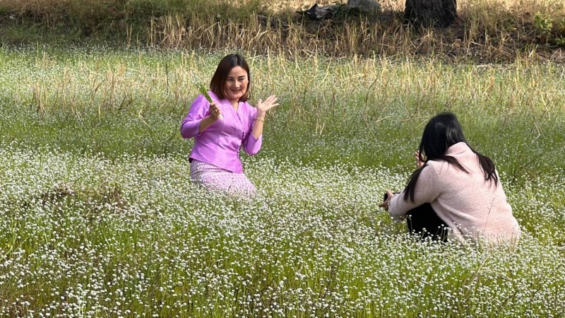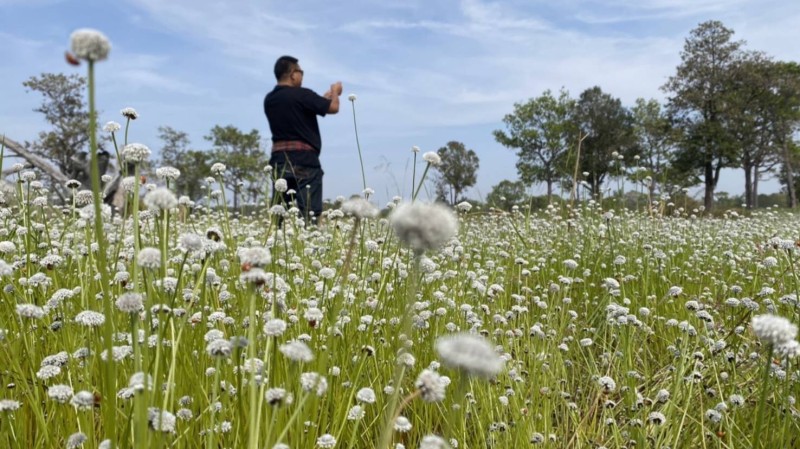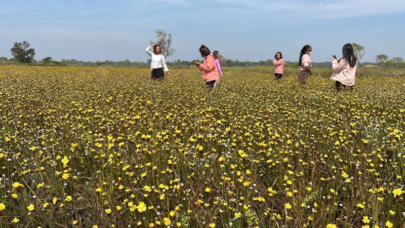 วันที่ 14 ธันวาคม 2565 ที่ จังหวัดศรีสะเกษ ในช่วงนี้อากาศได้หนาวเย็นลง อุณหภูมิลดลงเหลือ 14 องศา วันนี้ได้มีผู้พบเห็นทุ่งดอกกระดุมเงิน - กระดุมทอง หรือที่ชาวบ้านเรียกว่า “ดอกขี้กาก” ซึ่งเป็นวัชพืชของต้นข้าวของเกษตรกร แต่วันนี้หลังเก็บเกี่ยวข้าวออกไปแล้ว ดอกกระดุมเงิน - กระดุมทอง ยืนต้นสูงขึ้น ราว 50 เซนติเมตร แทงช่อดอกบานสะพรั่ง โดยกระดุมเงิน จะออกดอกสีขาวเงิน และกระดุมทองจะออกดอกสีเหลืองทอง โคนดอกสีน้ำตาลแก่ สลับไปกันเต็มทุ่งนา สวยงามยิ่งนัก ลูกสาวชาวบ้านได้ถ่ายรูปลงในเฟสบุค เพื่อนๆ พบเห็น ต่างพากันสอบถามว่า อยู่ที่ไหน และได้พากันแห่เข้าไปถ่ายรูปกันเป็นจำนวนมาก รวมทั้งนักท่องเที่ยวที่เริ่มทราบ เพราะความสวยงามดังกล่าว เกิดขึ้นเองตามธรรมชาติ ไม่มีใครปลูกได้ พบพื้นที่แปลงนาที่อุดมสมบูรณ์ ไม่ได้ใช้สารเคมี ในการทำนาข้าว โดยขณะนี้พบอยู่บนแปลงนาเป็นบริเวณกว้าง กว่า 16 ไร่ กำลังบานสะพรั่งสวยงาม ภายใต้อากาศที่หนาวเย็น อยู่ทางทิศตะวันออกเฉียงเหนือของหมู่บ้านลิ้นฟ้า ตำบลลิ้นฟ้า อำเภอยางชุมน้อย ห่างจากตัวเมืองศรีสะเกษ ราว 20 กิโลเมตร องค์การบริหารส่วนตำบลลิ้นฟ้า เตรียมพัฒนาเป็นแลนด์มาร์กเป็นแหล่งท่องเที่ยวของจังหวัด และนักท่องเที่ยว ยังพบว่ามีต้นตะแบก ที่ขึ้นอยู่ปากทางเข้าทุ่งนาแปลงที่มีดอกกระดุมเงิน - กระดุมทอง เกิดขึ้น เป็นต้นไม้ที่มีลักษณะเหมือนกับต้นไม้แห่งเวทมนต์ ในภาพยนต์เรื่อง แฮรี่พอตเตอร์ ด้วย