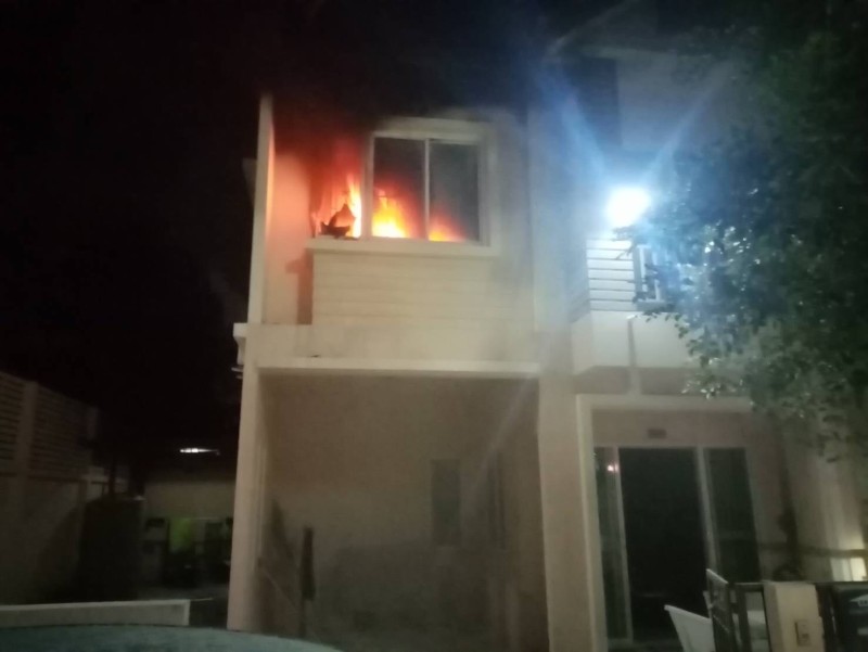 ที่เกิดเหตุลักษณะเป็นบ้านทาวน์เฮ้าส์สูง 2 ชั้น พบแสงเพลิงและกลุ่มควันพวยพุ่งออกจากหน้าต่างชั้น 2 ของบ้าน เจ้าหน้าที่ดับเพลิงเร่งฉีดน้ำสกัดใช้เวลาเพียง 10 นาที จึงสามารถควบคุมเพลิงไว้ได้ จากการตรวจสอบความเสียหายเบื้องต้น พบว่าไฟลุกไหม้บริเวณโต๊ะคอมมีเครื่องคอมพิวเตอร์หน้าจอได้รับความเสียหาย แต่ไม่มีผู้ได้รับบาดเจ็บและเสียชีวิต และพบว่ามีแมวจำนวน 2 ตัวหลบซ่อนอยู่ภายในห้องนอนของเจ้าของบ้านทำให้รอดชีวิต ส่วนสาเหตุคาดว่าอาจจะเกิดไฟฟ้าลัดวงจร เนื่องจากก่อนเกิดเหตุมีการเปิดเครื่องคอมพิวเตอร์ทิ้งไว้ก่อนจะเกิดเหตุเพลิงไหม้