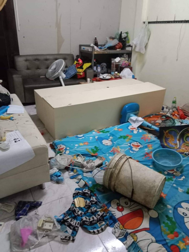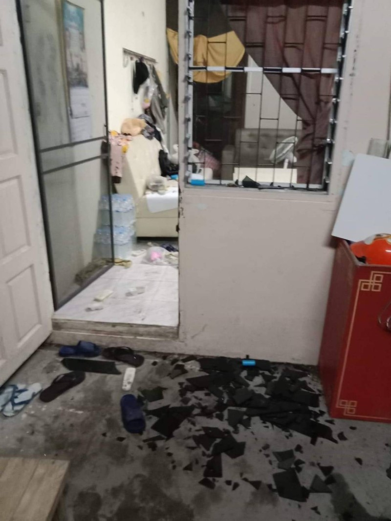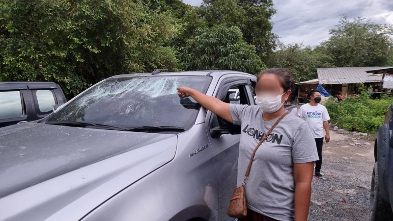 เมื่อสามีหลบออกจากห้องไปได้เพียงครู่เดียว กลุ่มผู้ก่อเหตุ ได้บุกพังประตูเข้ามาภายในห้อง เมื่อเห็นว่าสามีตนไม่ได้อยู่ภายในห้องแล้ว ก็เริ่มทุบตี พังทรัพย์สิน สิ่งของต่างๆที่อยู่ภายในห้องเสียหายจนหมด ตนพยายามยกมือไหว้ พูดว่าอย่าทำๆ เนื่องจากลูกสาวตนอายุ 10 ตกใจมากยืนร้องไห้ตัวสั่นเพราะความหวาดกลัว แต่ก็ไม่เป็นผล หลังจากทุบพังสิ่งของในห้องจนหมดแล้ว กลุ่มผู้ก่อเหตุได้เดินไปที่รถยนต์กระบะของตนที่จอดอยู่หน้าห้องพัก กระโดดขึ้นหลังคารถ ทุบทำลายตัวรถ จนเสียหายทั้งคัน จากนั้นได้ ร่วมกันปล้นเอารถจักรยานยนต์ ของตนขับหลบหนีออกไปพร้อมพร้อมกันกับกลุ่มผู้ก่อเหตุ