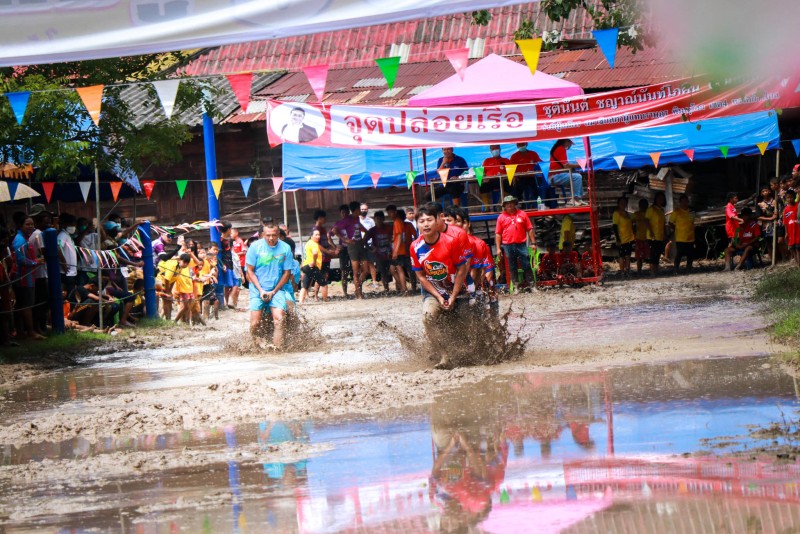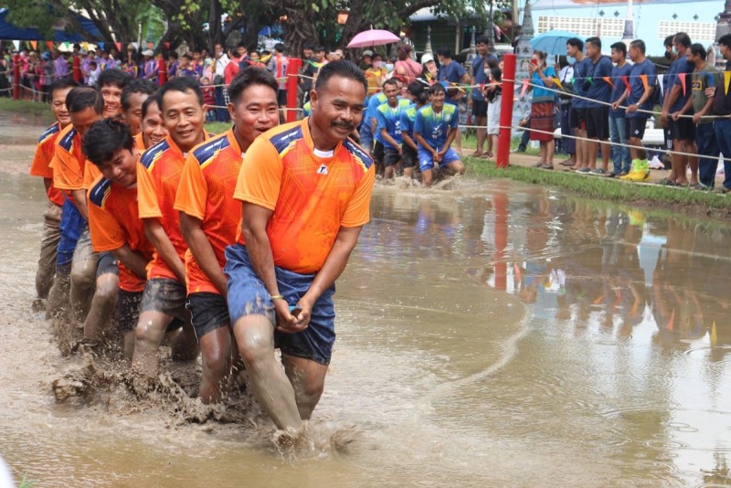 ส่วนบรรยากาศการแข่งขัน ตั้งแต่เช้านี้เต็มไปด้วยความสนุกสนาน โดยใช้ลานวัดเป็นสนามแข่ง ระยะทางยาว 100 เมตร ทางผู้จัดได้นำน้ำมาเปิดเข้าพื้นที่ให้ดินแฉะเปื้อนในสภาพเจิ่งด้วยน้ำและขี้เลน ขี้โคลน ถ้าหากวิ่งไม่พร้อมกันก็จะสะดุดขาพากันล้มลุกคลุกคลานก่อนจะเข้าเส้นชัย ทีมใดล้มก็จะถือว่าแพ้ทันที โดยมีกองเชียร์ที่นั่งลุ้นยืนลุ้นอยู่สองฝั่งทาง คอยส่งเสียงเชียร์ให้กำลังใจทีมโปรดของตัวเองอยู่รอบสนาม